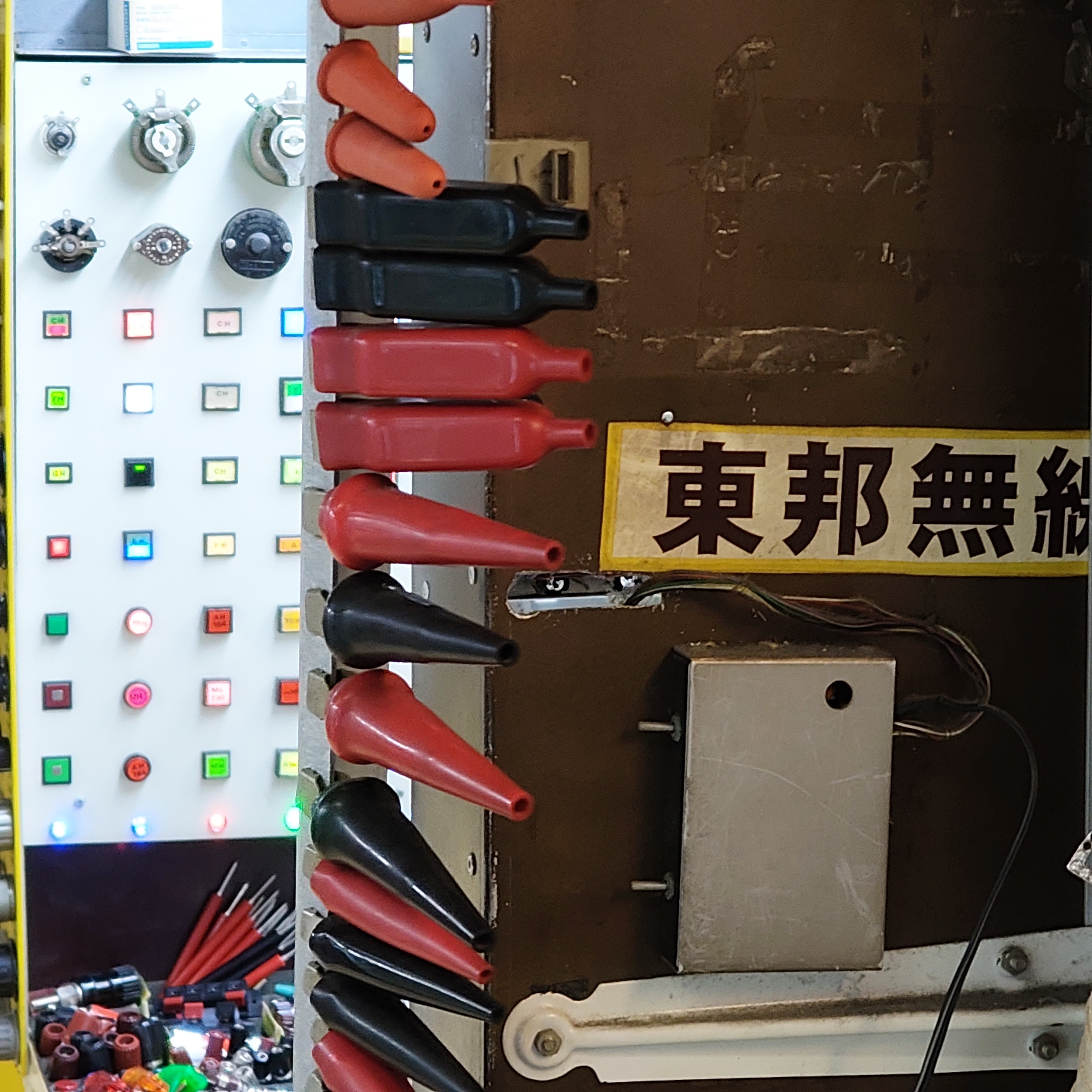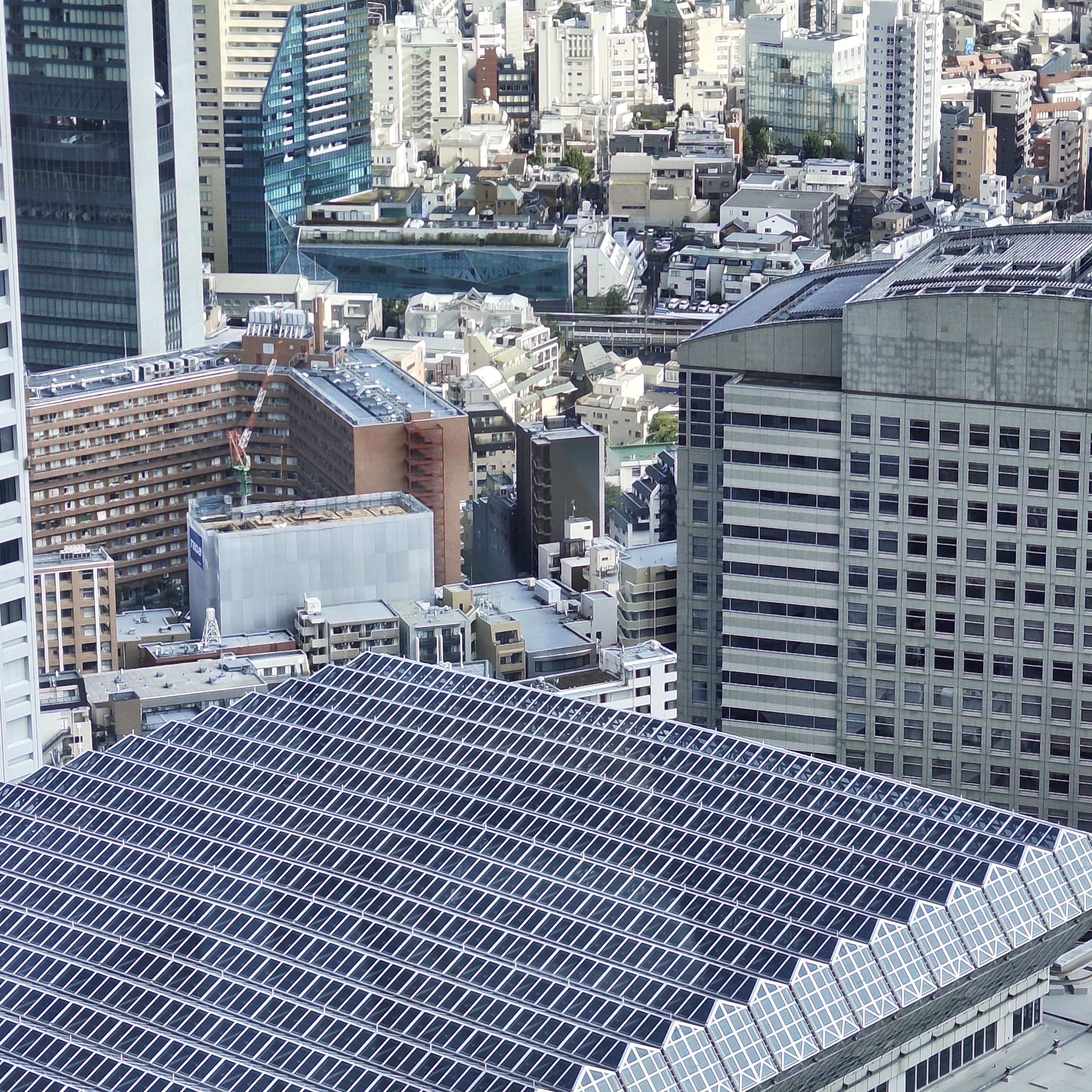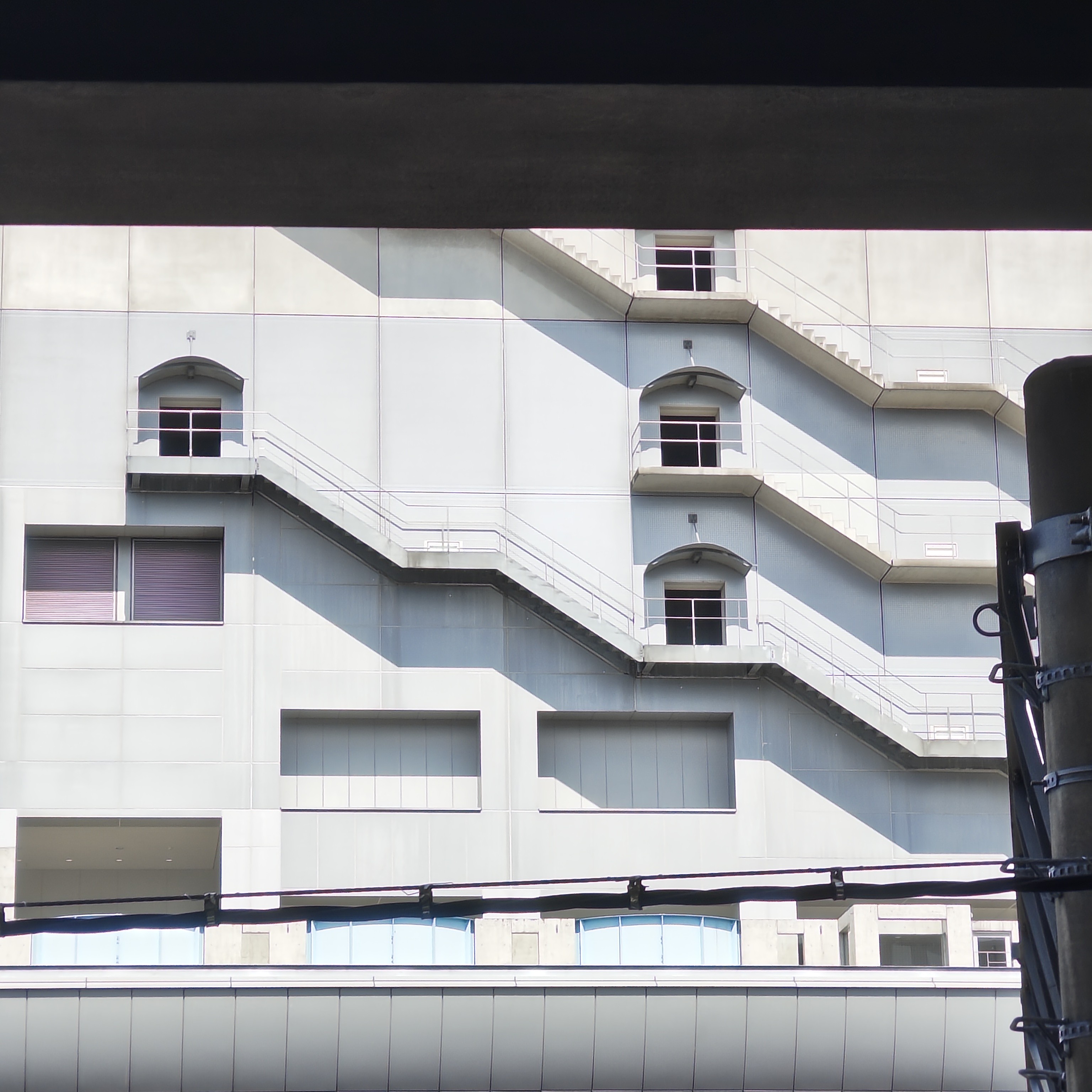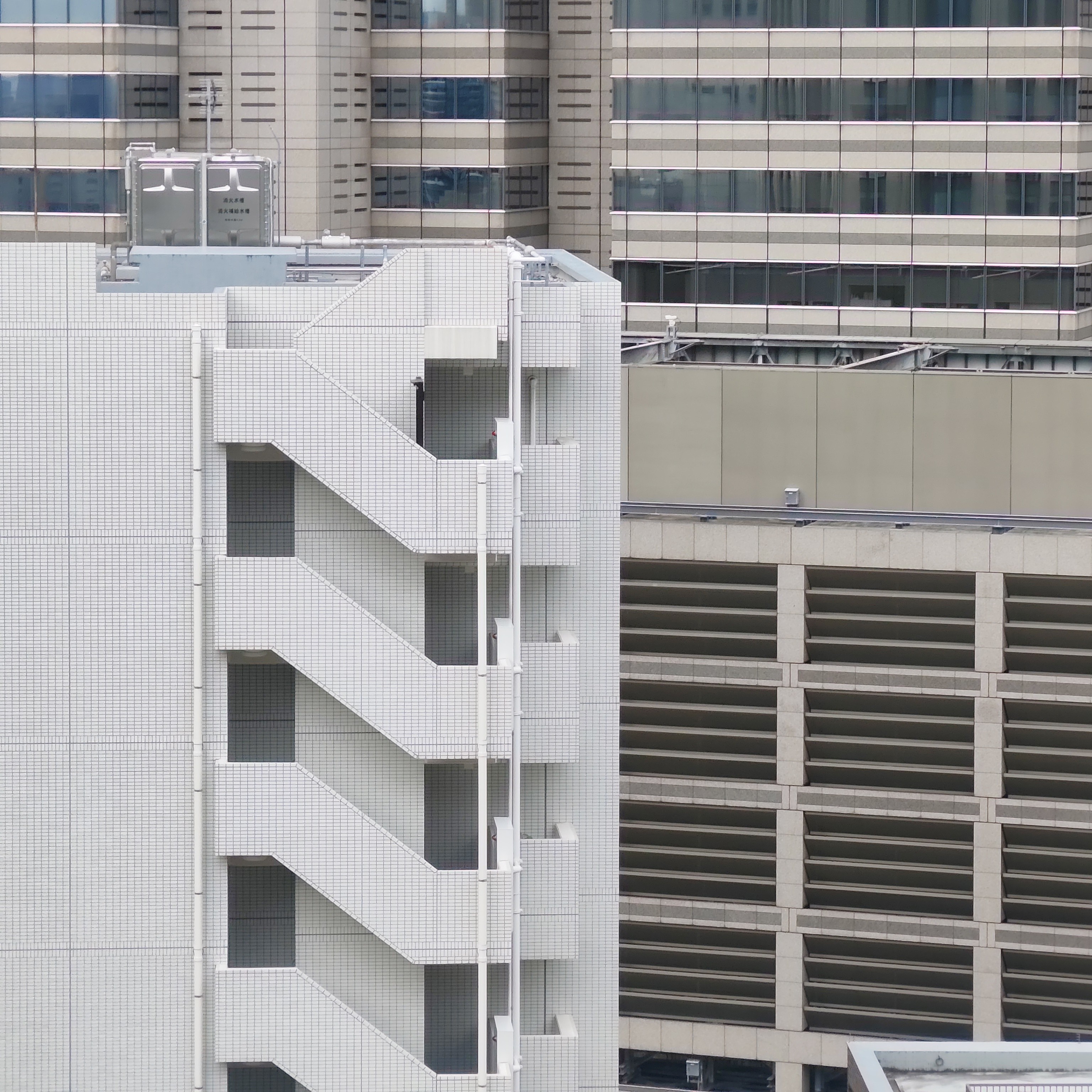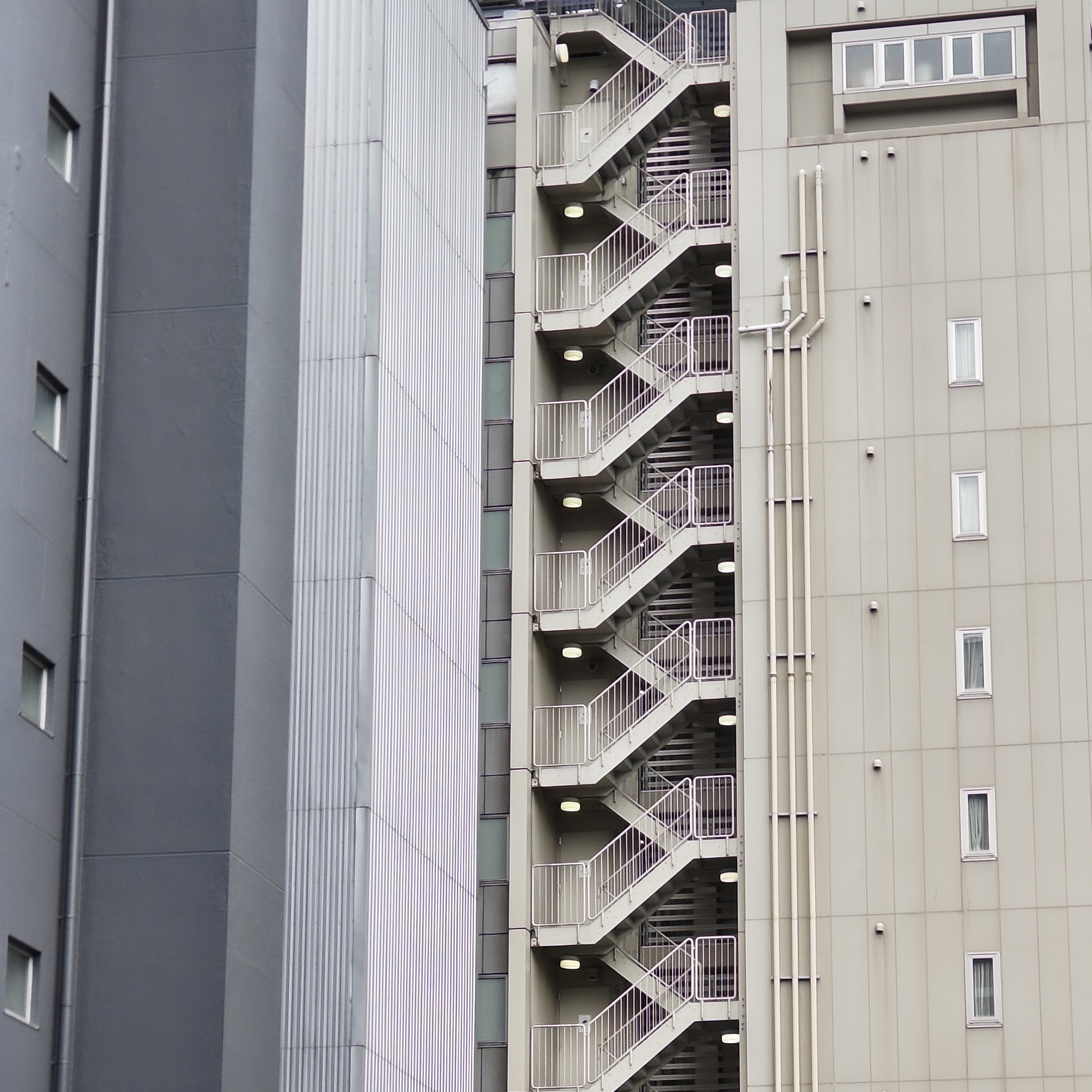 An iron red staircase contrasts with green shrubbery symbolizing the constant mix of natural gardens and industrial towers in Tokyo.